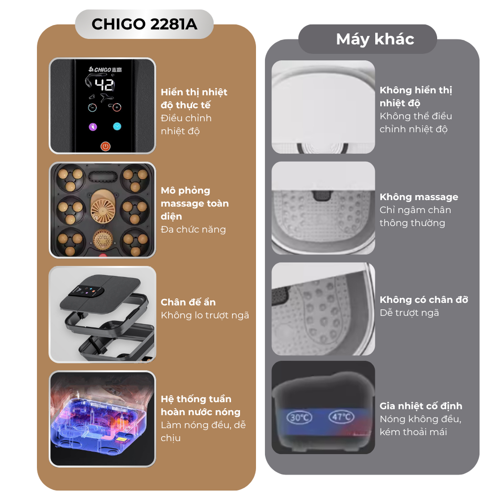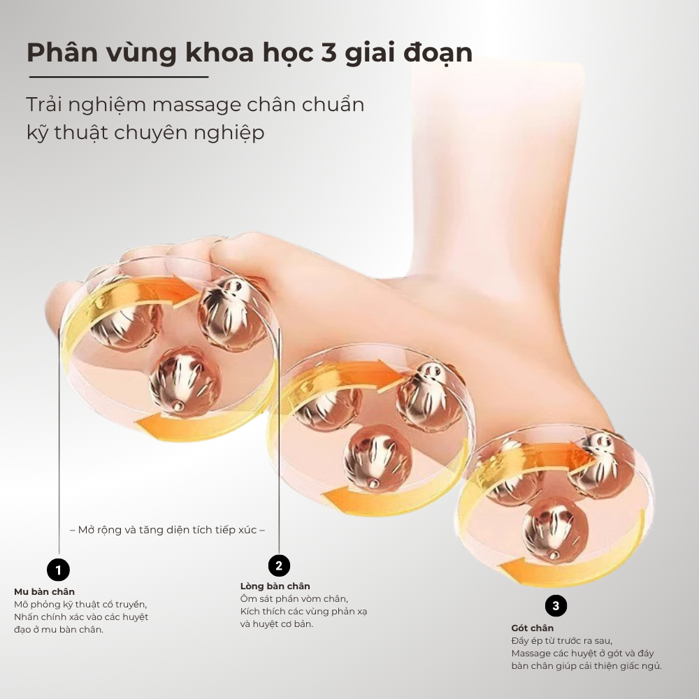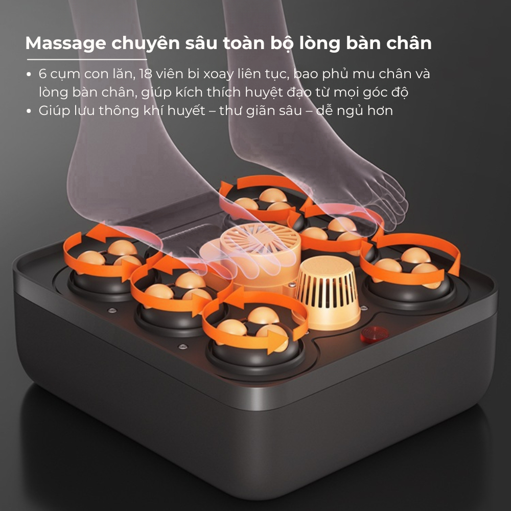 - Bồn ngâm chân massage chân có 6 con lăn bố trí trùng với các huyệt đạo và 2 đèn hồng ngoại giúp tăng cường lưu thông máu