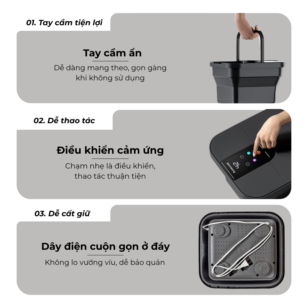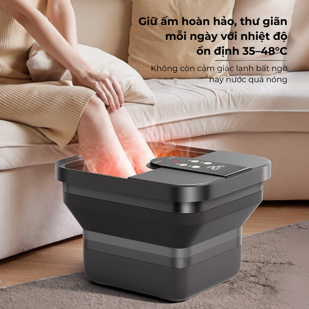 - Máy ngâm chân có thể hẹn giờ tự động tắt và có thể gấp gọn tiện lợi mang đi nhiều nơi