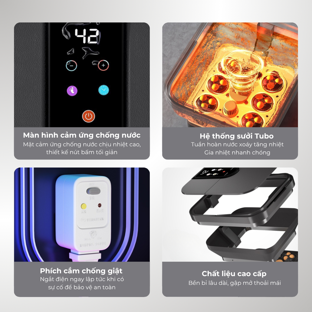 - Bồn ngâm chân được trang bị màn hình LCD cảm ứng hiển thị nhiệt độ và điều khiển từ xa. Làm nóng nước và duy trì nhiệt độ từu 35-48 độ