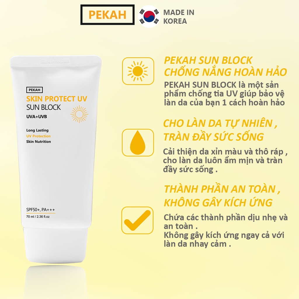 Kem chống nắng Pekah xuất xứ từ Hàn Quốc với công thức chống nắng vật lý, Pekah mang đến sự an toàn tuyệt đối cho làn da. Khác với kem chống nắng hóa học, công thức vật lý hoạt động như một tấm khiên phản chiếu tia UV ngay trên bề mặt da, không thấm sâu vào da nên hạn chế tối đa nguy cơ kích ứng.