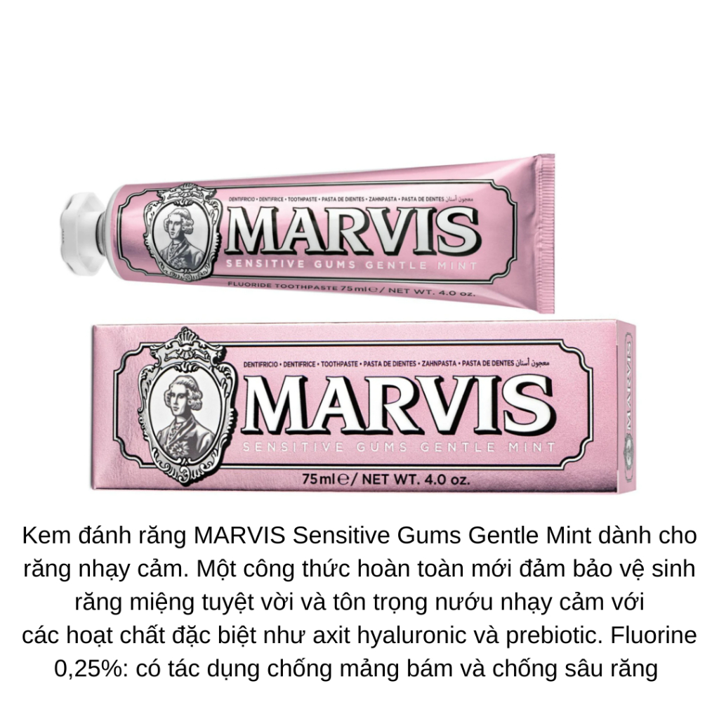 - Marvis Jasmin Mint (Màu tím): Hương bạc hà kết hợp chiết xuất hoa nhài, đem lại hơi thở thơm tho, mát mẻ lãng mạn.