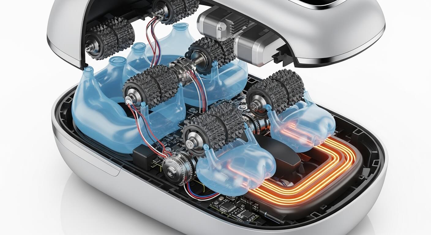 Một chiếc máy massage chân thông thường được lắp ráp như một ekip xoa bóp chuyên nghiệp, mỗi bộ phận đảm nhận một vai trò riêng biệt: