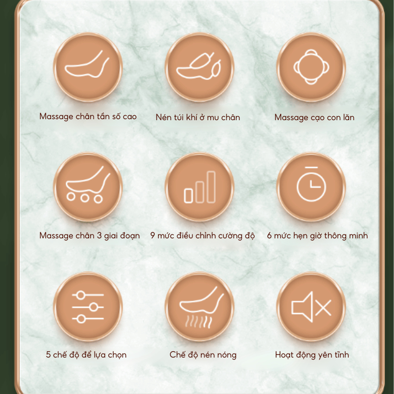 Máy tích hợp 6 túi khí bao quanh toàn bộ bàn chân với 9 mức cường độ điều chỉnh. Cảm giác bóp – thả nhịp nhàng giúp máu lưu thông tốt hơn, phù hợp cho người thường xuyên bị tê mỏi hoặc tuần hoàn kém.