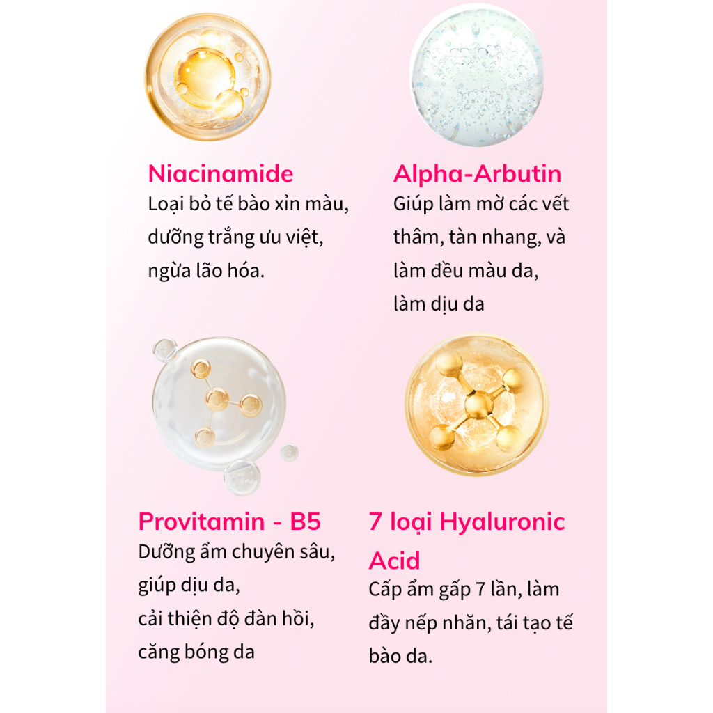 - Chứa các thành phần dưỡng da mẽ như Niacinamide, Alpha Arbutin, hỗ trợ dưỡng sáng cho làn da gặp vấn đề