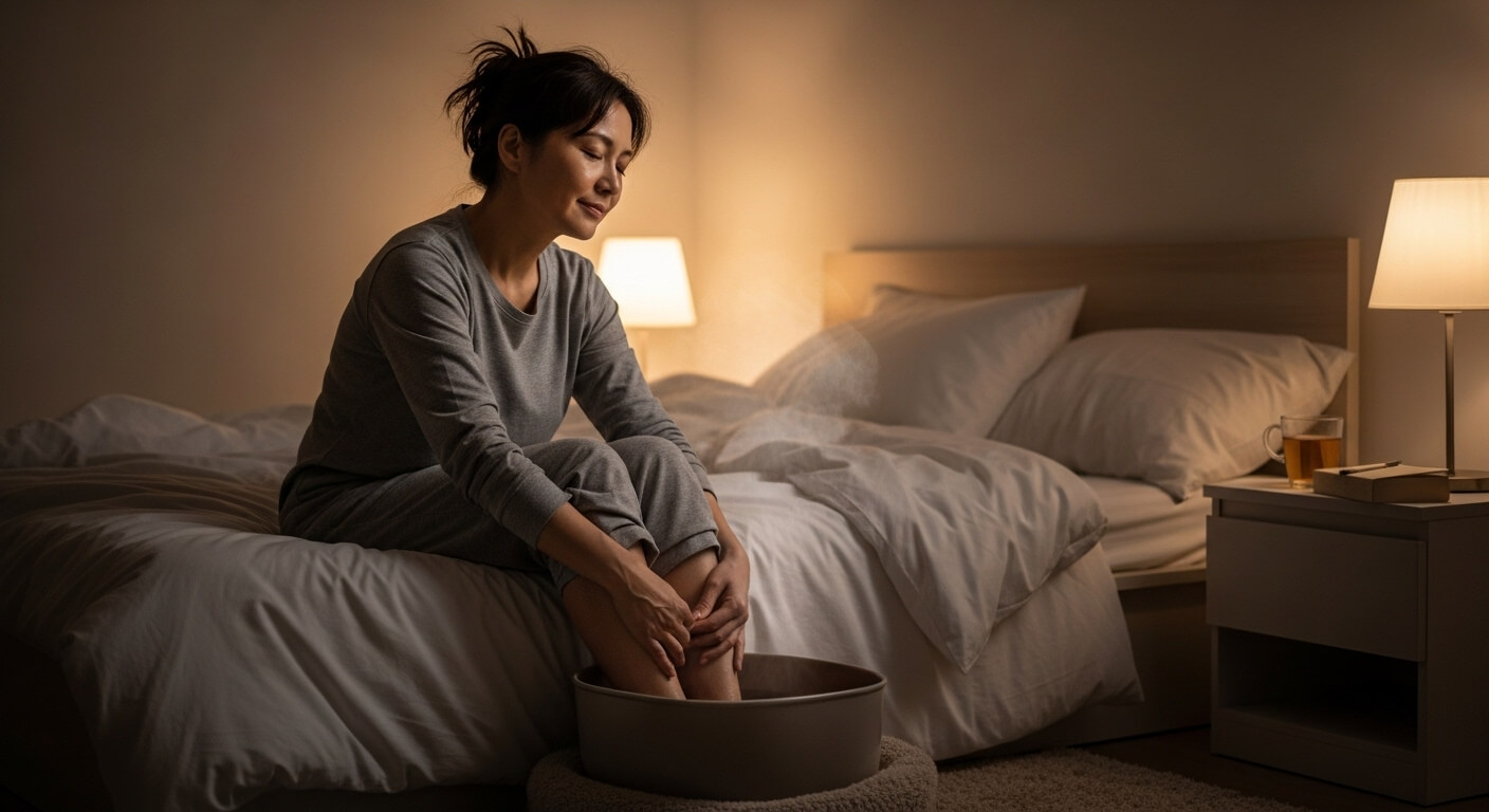 Trước khi ngủ: Ngâm chân ấm 15-20 phút giúp cơ thể hạ nhiệt tự nhiên, hỗ trợ quá trình đi vào giấc ngủ