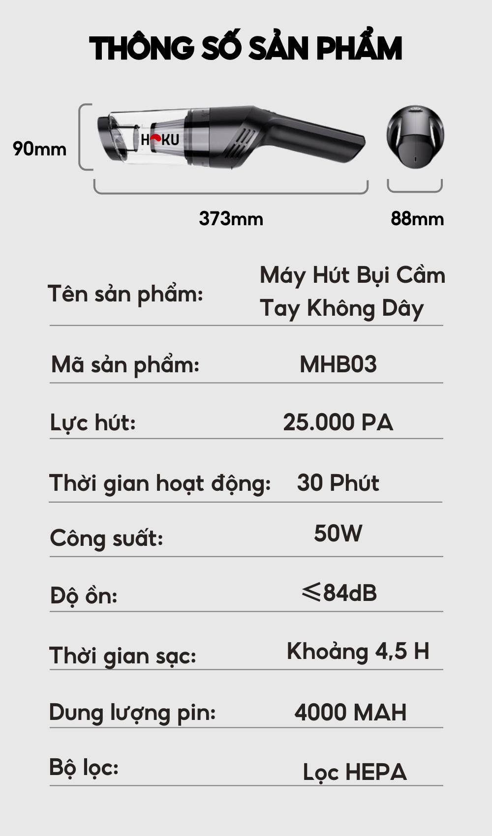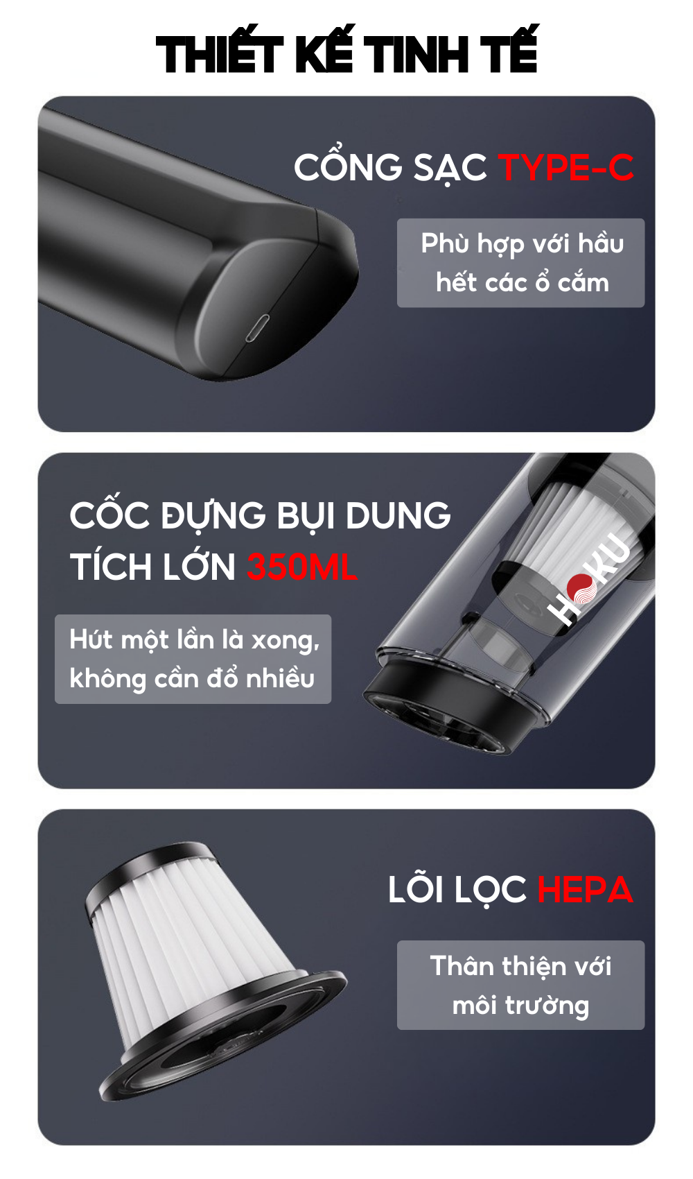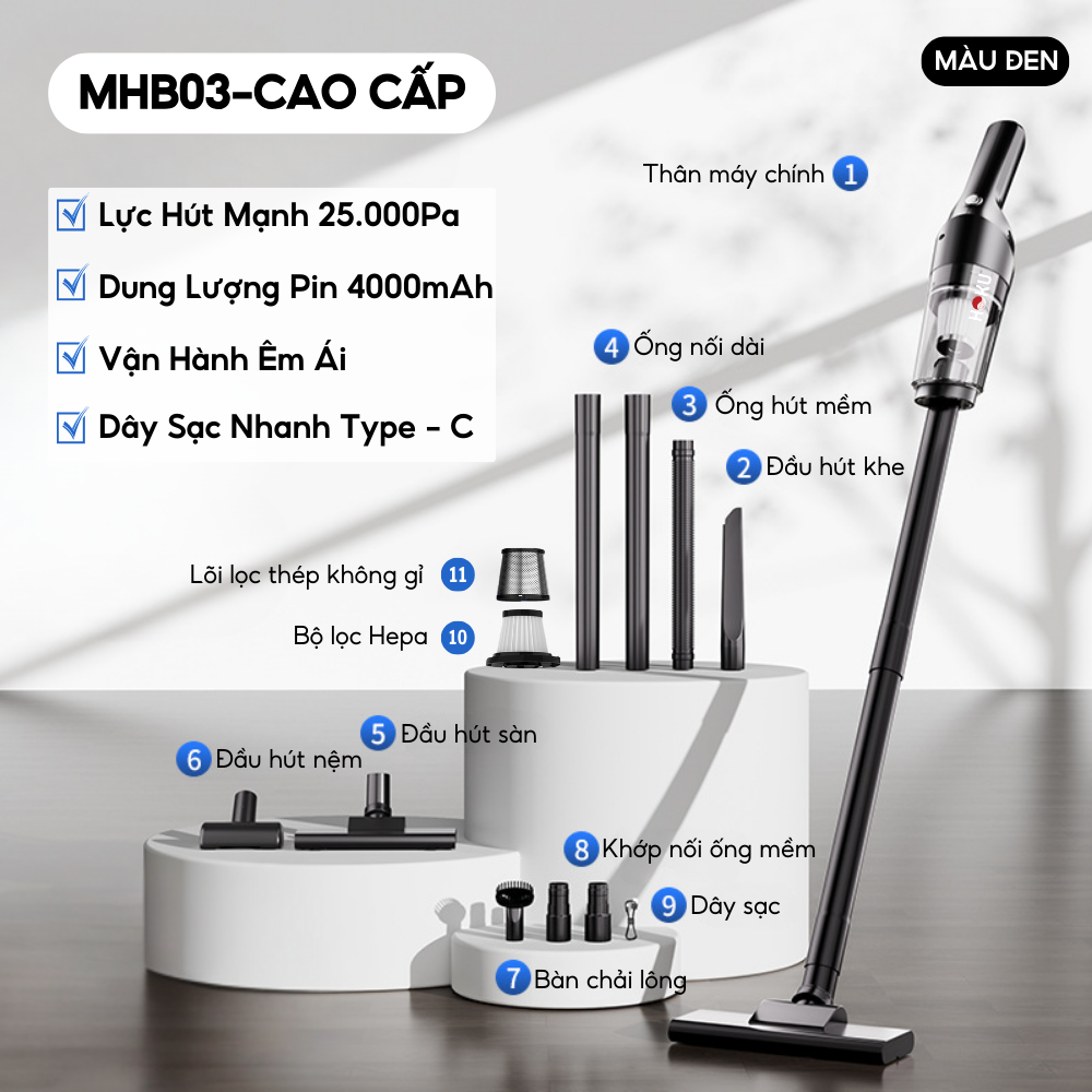 HOKU mang đến giải pháp làm sạch toàn diện với máy hút bụi cầm tay không dây – thiết kế nhỏ gọn, lực hút cực mạnh 25.000Pa, hoạt động liên tục 30 phút, giúp loại bỏ bụi mịn, lông thú và vi khuẩn khỏi nệm, sofa, ghế ô tô, bàn làm việc chỉ trong tích tắc.