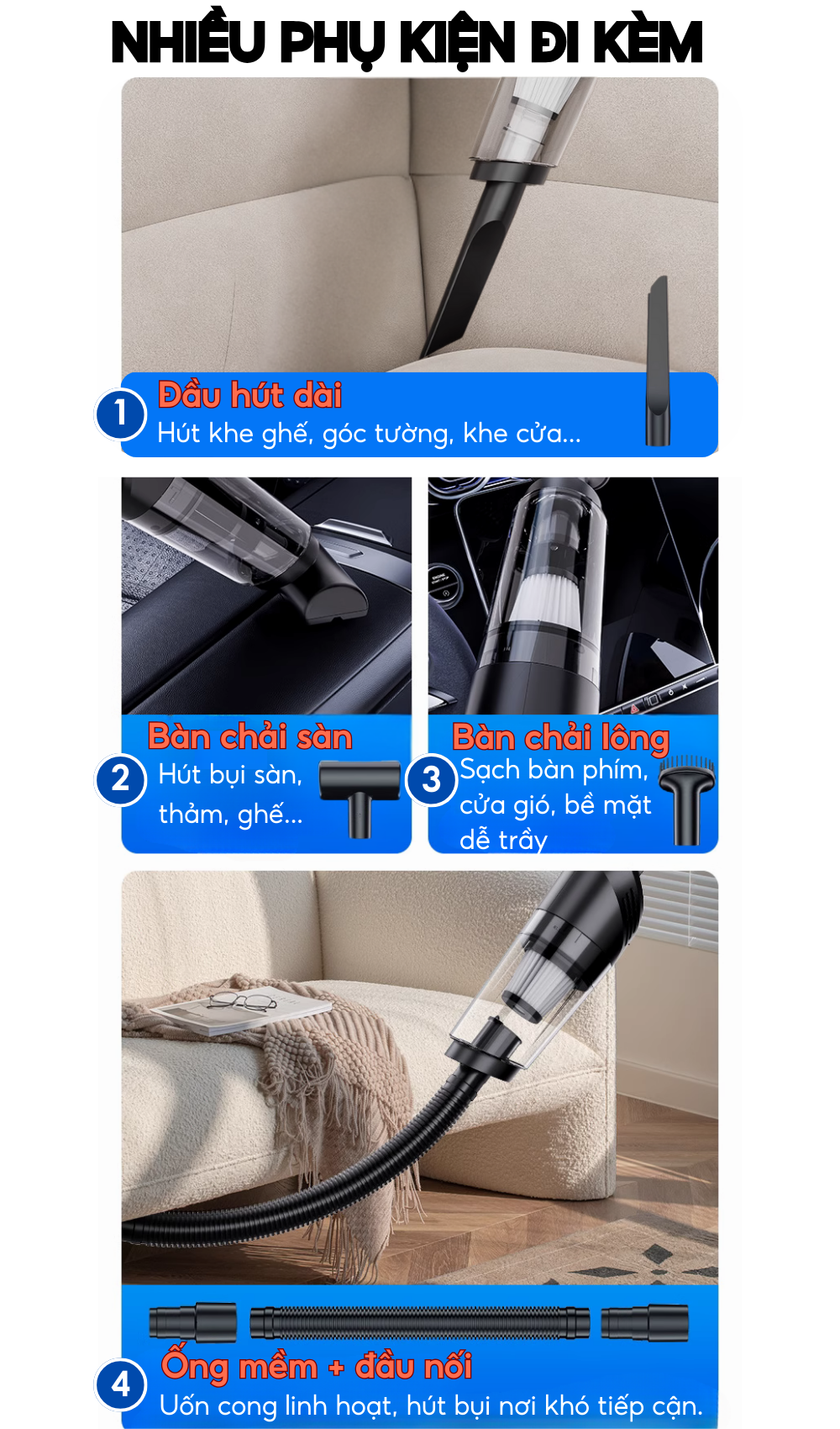 ✅ Phụ kiện đa dạng, phù hợp cho mọi ngóc ngách: khe ghế, bàn phím, ô tô, gối đệm